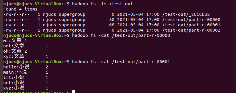 查看文本内容hdfs dfs -cat /test-in/小说第一hadoop jar TF-IDF-1.0-SNAPSHOT.jar /test-in /test-out (调整为自己的jar包路径) 输出目录不能事先存在,只能由程序创建,如果已经有test-out目录, 可以通过hadoop fs -rm -r -skipTrash /test-out删除hadoop fs -ls /test-out 设置了几个reducer就有几个输出文件 hadoop fs -cat /test-out/part-r-00000 可以看到已经正确输出了