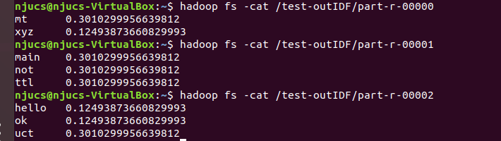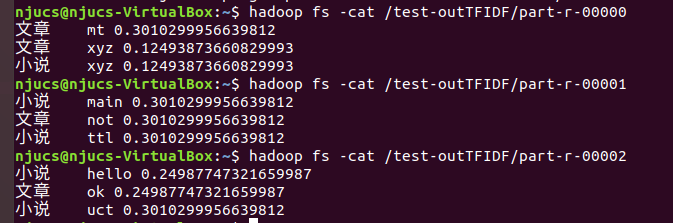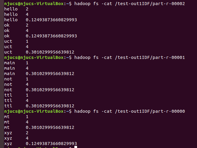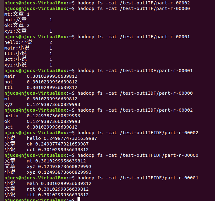 public static void main(String[] args) { Configuration conf = new Configuration(); try { Job job = Job.getInstance(conf); job.setJobName("TFIDF-job"); job.setJarByClass(TFIDFMR.class); job.setMapperClass(TFIDFMR.TFIDFMapper.class); job.setPartitionerClass(TFIDFMR.TFIDFPartitioner.class); job.setNumReduceTasks(taskNum); job.setReducerClass(TFIDFMR.TFIDFReducer.class); job.setOutputKeyClass(Text.class); job.setOutputValueClass(Text.class); // String inputPath1 = args[0] + "TF"; String inputPath2 = args[0] + "IDF"; String outputPath = args[1] + "TFIDF"; Path fileOutPath = new Path(outputPath); FileSystem fileSystem = FileSystem.get(conf); if (fileSystem.exists(fileOutPath)) { fileSystem.delete(fileOutPath, true); } FileInputFormat.addInputPaths(job, String.join(",", inputPath1, inputPath2)); FileOutputFormat.setOutputPath(job, fileOutPath); job.waitForCompletion(true); } catch (Exception e) { e.printStackTrace(); } } hadoop jar TF-IDF-1.0-SNAPSHOT.jar /test-out /test-out (调整为自己的jar包路径) 输出目录不能事先存在,只能由程序创建,如果已经有输出目录, 可以通过hadoop fs -rm -r -skipTrash /test-outIDF删除 [RE:代码加了检测,已经存在的话会先自动删除]hadoop fs -ls /test-outIDF